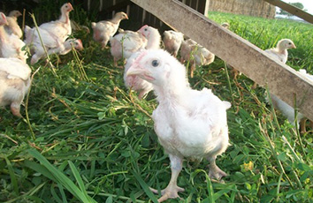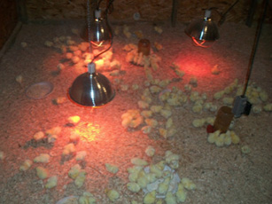 Our chicks are sent through the mail from an Iowa hatchery when they are 1 day old. Once they arrive here at the farm, we take them out of the boxes, dip their beaks in water and set them loose in the wide, open space of the brooder house. They have free access to water and an organic grain starter mix. Chicks are very temperature sensitive, so we have several heat lamps hanging from the ceiling, along with a regulated heater.